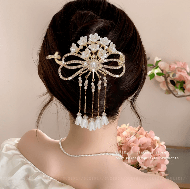 ✨ Thiết kế tua nơ mềm mại kết hợp cùng kẹp tóc chắc chắn, tạo điểm nhấn nhẹ nhàng và nữ tính cho mái tóc. Những dải tua rủ xuống duyên dáng giúp tổng thể trở nên thanh lịch, ngọt ngào và nổi bật trong mọi hoàn cảnh.